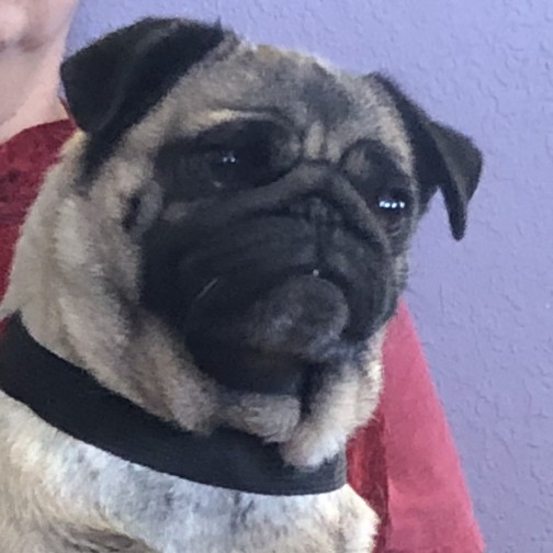Ugly Mugs Cheerful born 12/10/2022 at Comet Ranch in North Dakota. Cheerful is a descendant of an Ugly Mugs Pug that we sold to Comet Ranch some years ago. Cheerful is a very silly dog. She loves to play with anything and everything. Cheerful has had some difficulty with scratching at her ears, and we are currently working at healing some sores that she has there. But her overall health is excellent. She would love to have some active children or other pets to wrestle and play with.